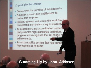 Initially, John Atkinson spoke about changes in society over the 50 years’ period, with relevance to politics, morals and particularly in education. He reminded the audience of some significant educational initiatives from various governments such as: the 1944 Education Act; the 1967 Plowden Report; the 1981 impetus in catering for special educational needs; the Baker changes in 1988, and the introduction of the National Curriculum in the 1990s. He also commented in detail about the impact of OFSTED.