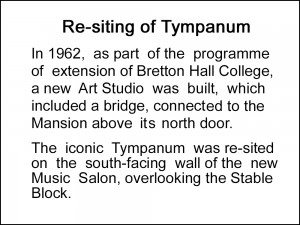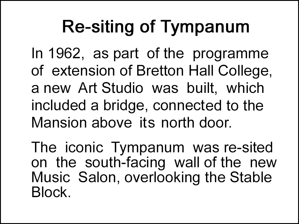 Although most of the post-1960 buildings were demolished in 2017, the decorative carvings were salvaged and most were safely stored in anticipation of their being inserted in strategic positions during the process of converting Bretton Hall into a luxury hotel.