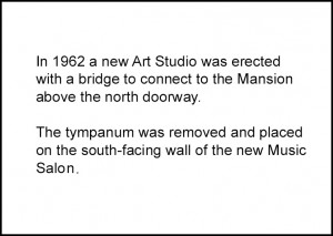Tympanum In 1839, the large tympanum shown above was carved and placed above the entrance door in the north-facing section of the mansion.